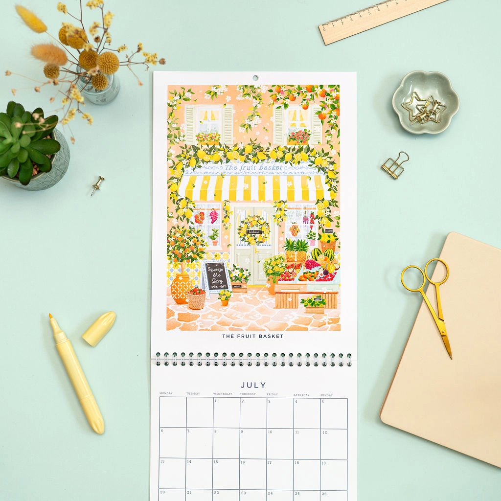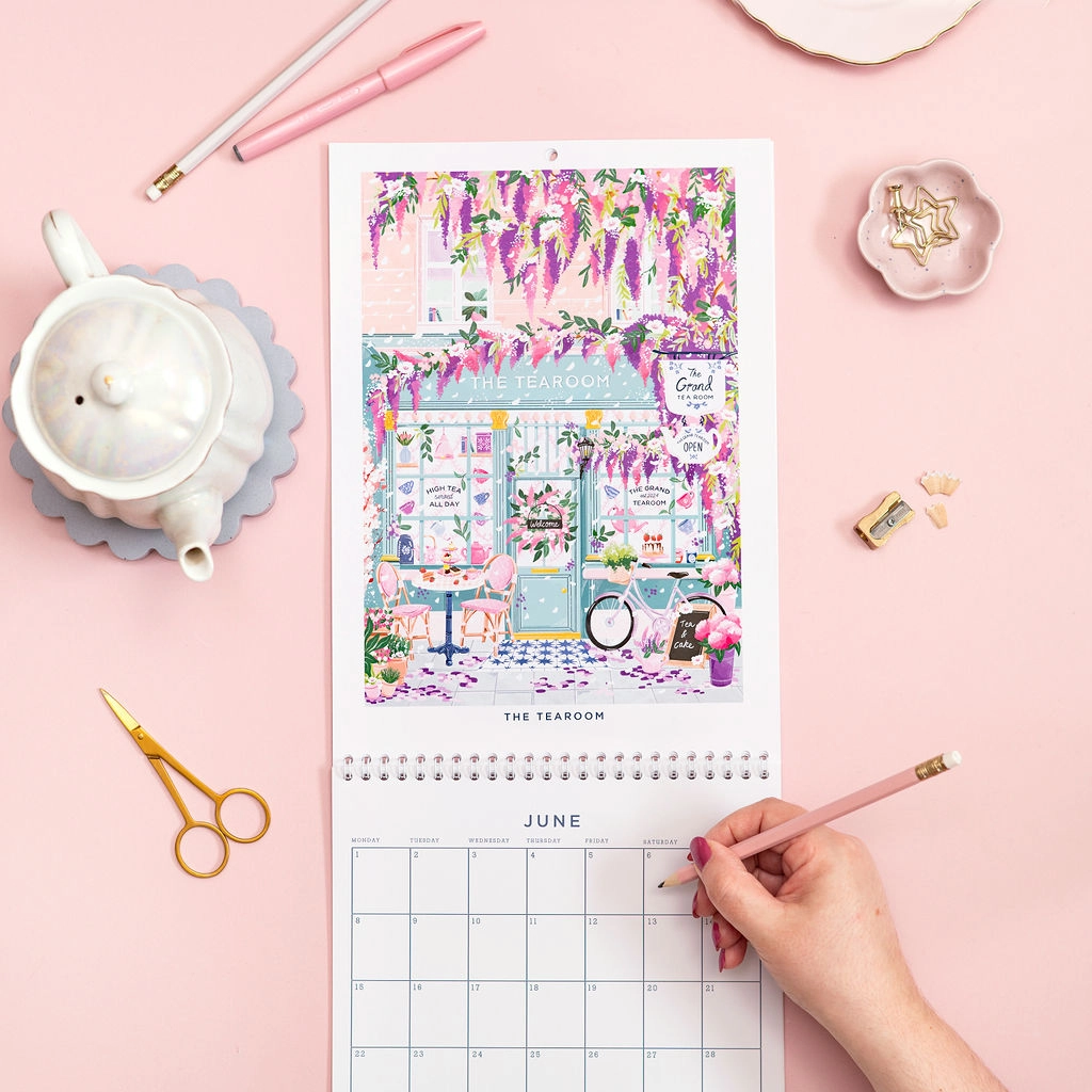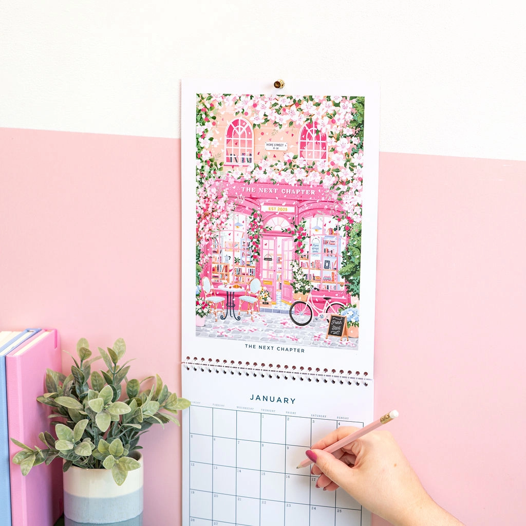 Veggkalenderen med butikkfasader for 2026 er illustrert av Simply, Katy og har tolv vakkert detaljerte illustrasjoner av butikkfasader for å feire årstidene. Fra sjarmerende bokhandlere og blomsterfylte kafeer til koselige bakerier og festlige butikker, avduker hver måned en ny butikkfasade designet for å fange gleden ved det skiftende året.