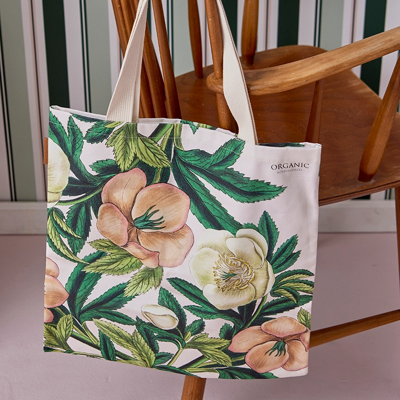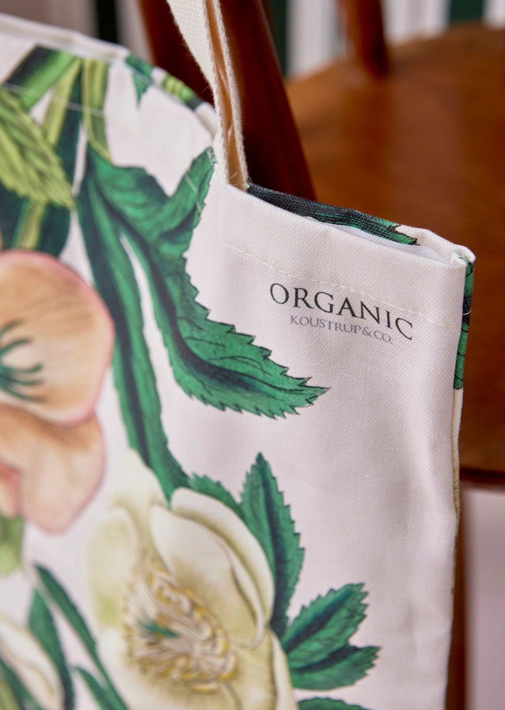 Nydelig veske i økologisk bomull med juleroser/påskeklokker.