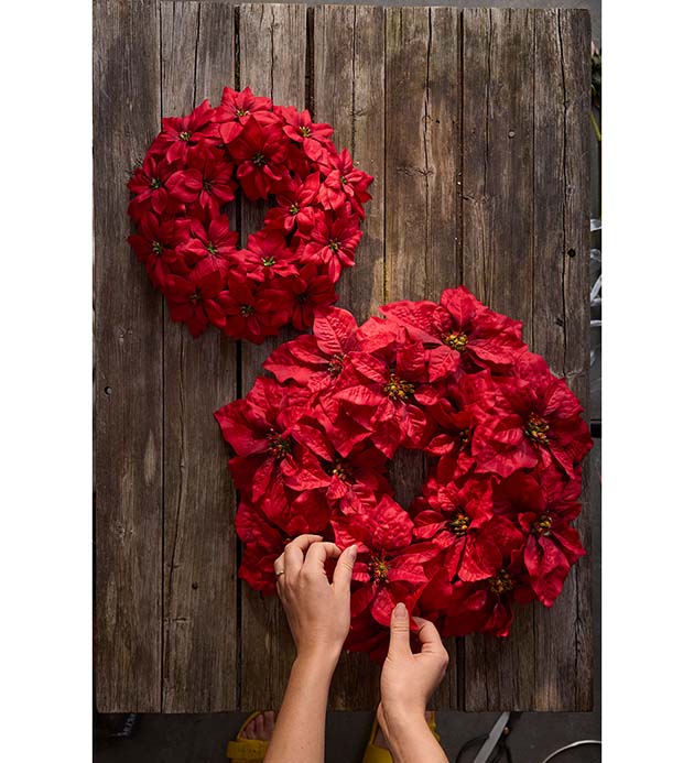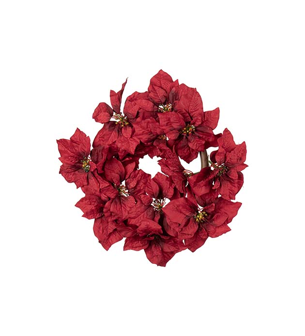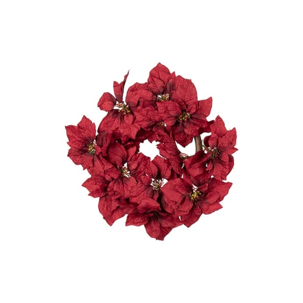 Flott krans med røde julestjerner. Diameter 50 cm. Like flott på veggen som på bordet.