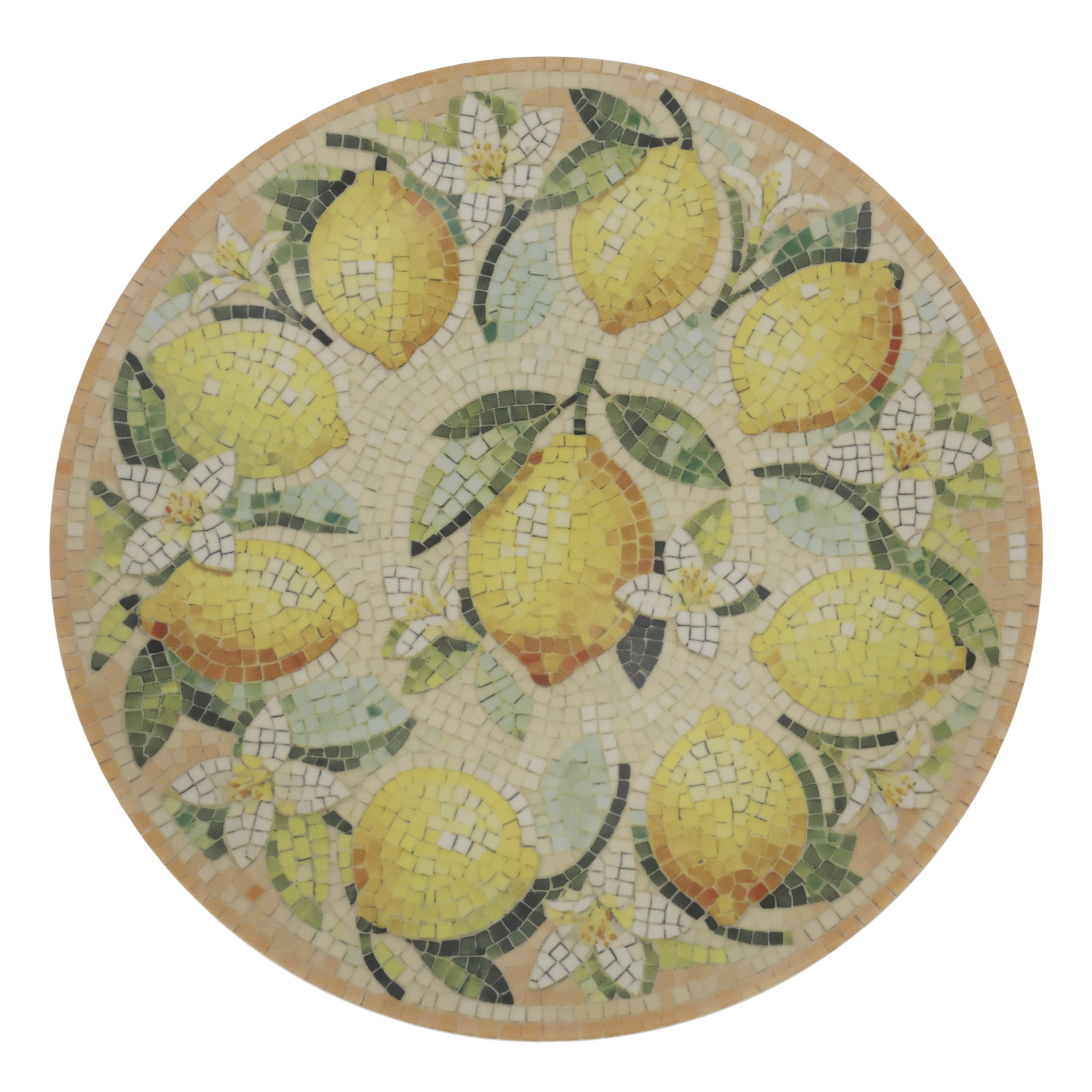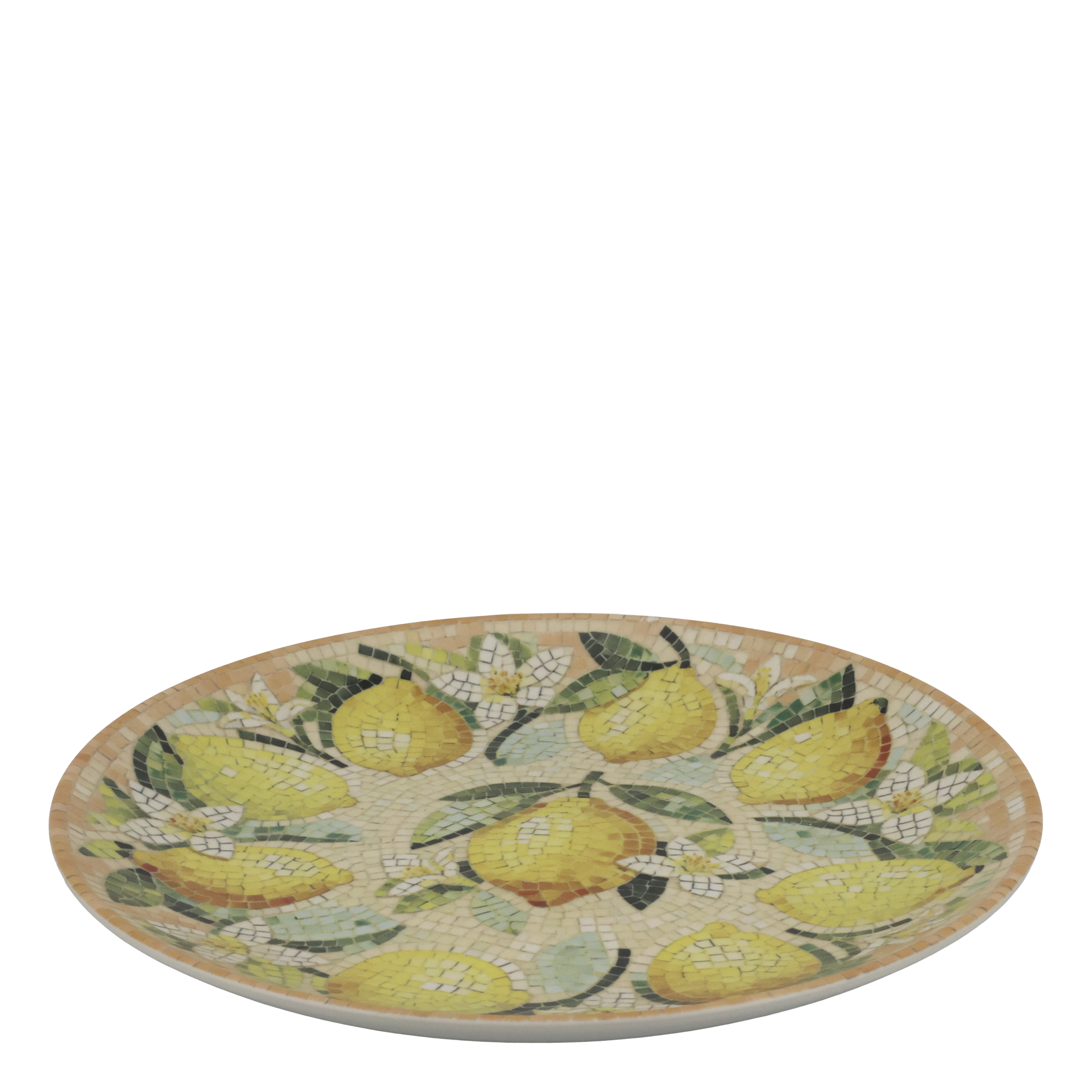 Vakkert fat I mosaic mønster med sitroner. Tåler oppvaskmaskin og mikrobølgeovn. Laget av steintøy som er godkjent til bruk og kontakt med mat.