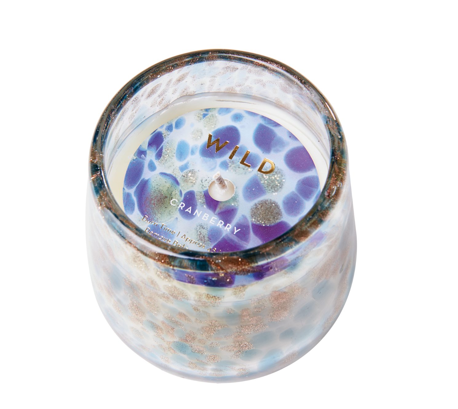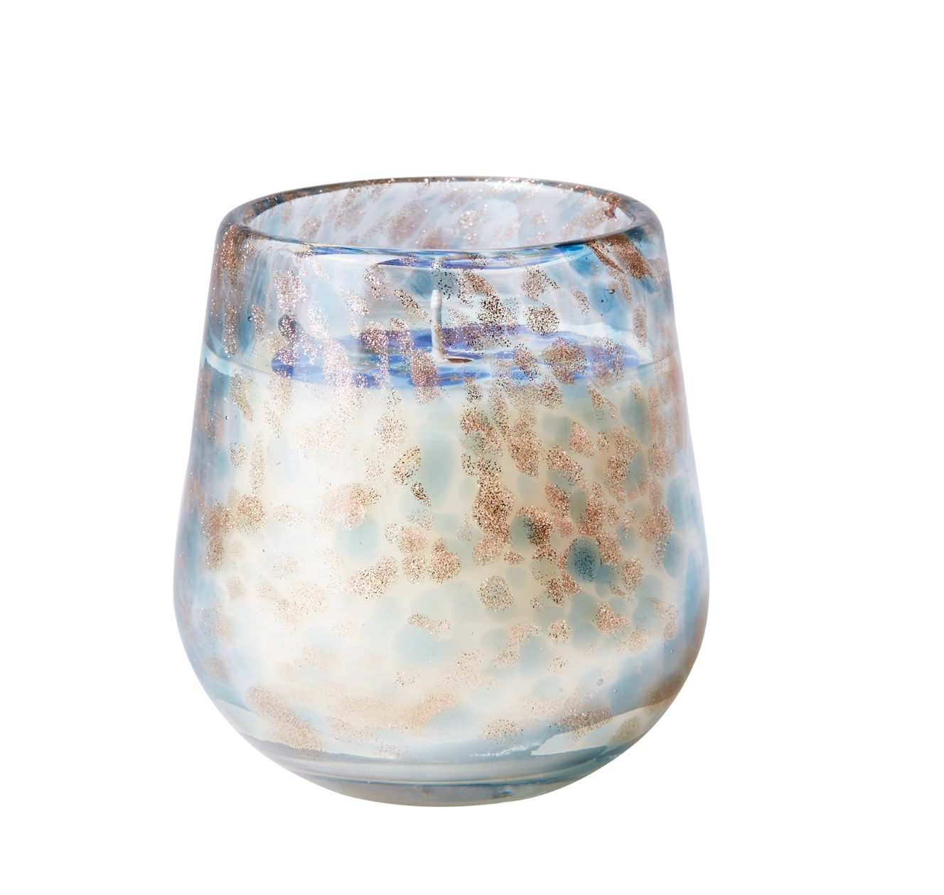 For et vakkert duftlys! Glasset er munnblåst, og har små spetter av “gull” i seg. Et vakkert blikkfang, med en behagelig duft. Brenntid 48 timer. Etter at lyset er ferdig kan en bruke glasset som vase eller som lykt.