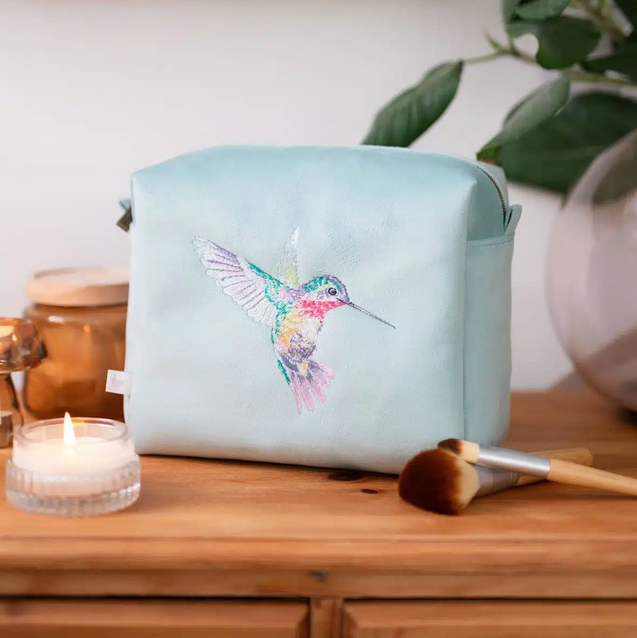 Denne sminkepungen er ideell for oppbevaring av nødvendige ting, og har det vakkert broderte «Wisteria Wishes»-designet både foran og bak. Laget av mykt stoff med et romslig interiør og en sikker glidelåslukking, vil denne sminkepungen være en omtenksom og stilig gave.