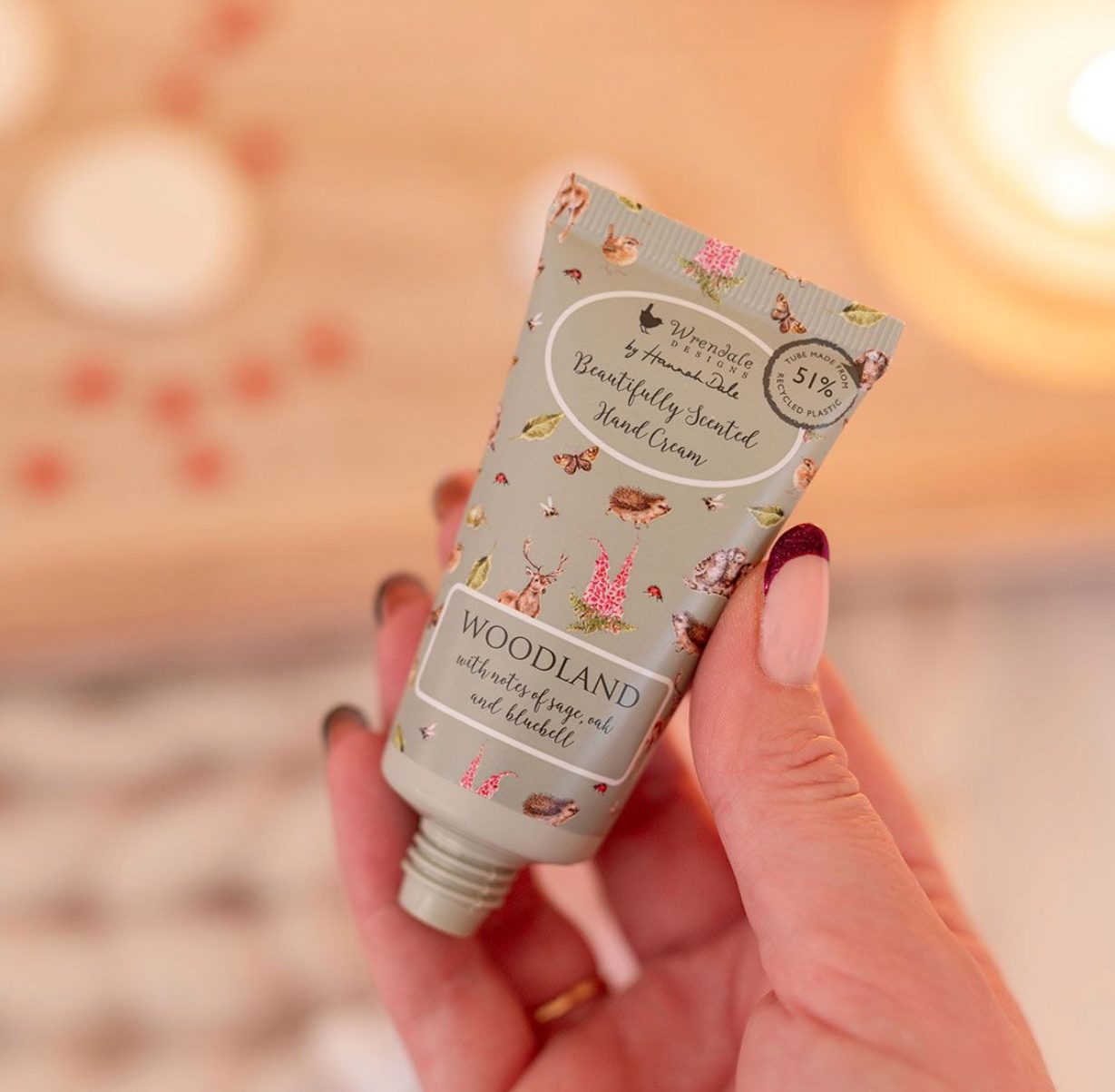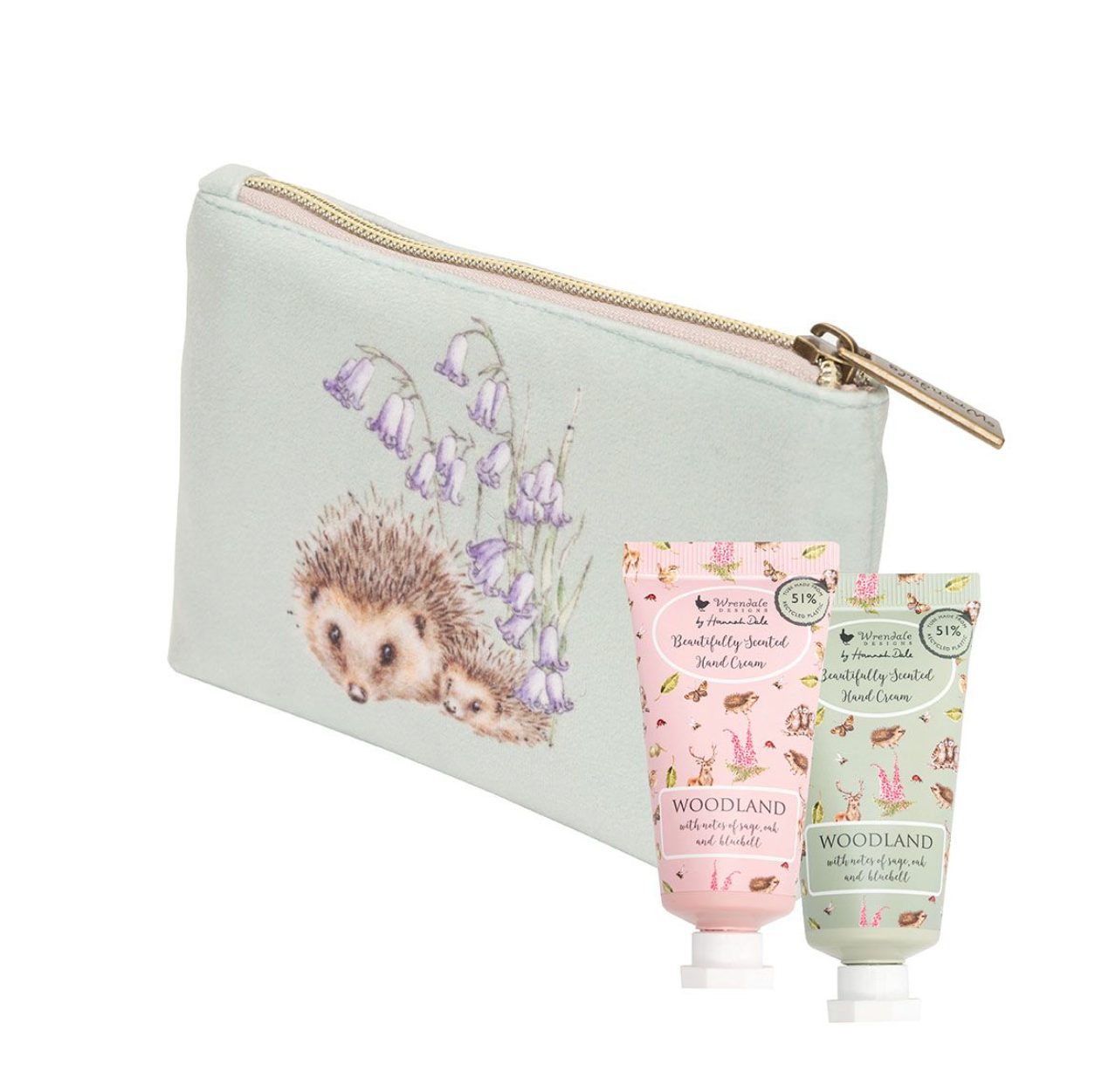 Dette håndkremsettet er en flott gave. Det inneholder to mini-håndkremer med duft av salvie, eik og blåklokke, samt en vakker, gjenbrukbar, myk pose som er perfekt for oppbevaring av sminke eller toalettartikler. Posen har pinnsvin- og ugledesign på en myk grønn bakgrunn.